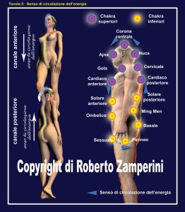- il chakra, in TEV, può essere catalogato come principale o secondario. I chakra principali sono 14 e sono alimentati direttamente dal circuito principale, cioè da un grande canale di circolazione energetico che circumnaviga il nostro corpo anteriormente e posteriormente e che lo divide in sinistra e destra esattamente come un piano saggitale. Tutti i chakra non alimentati da questo canale energetico (canale principale) sono secondari.