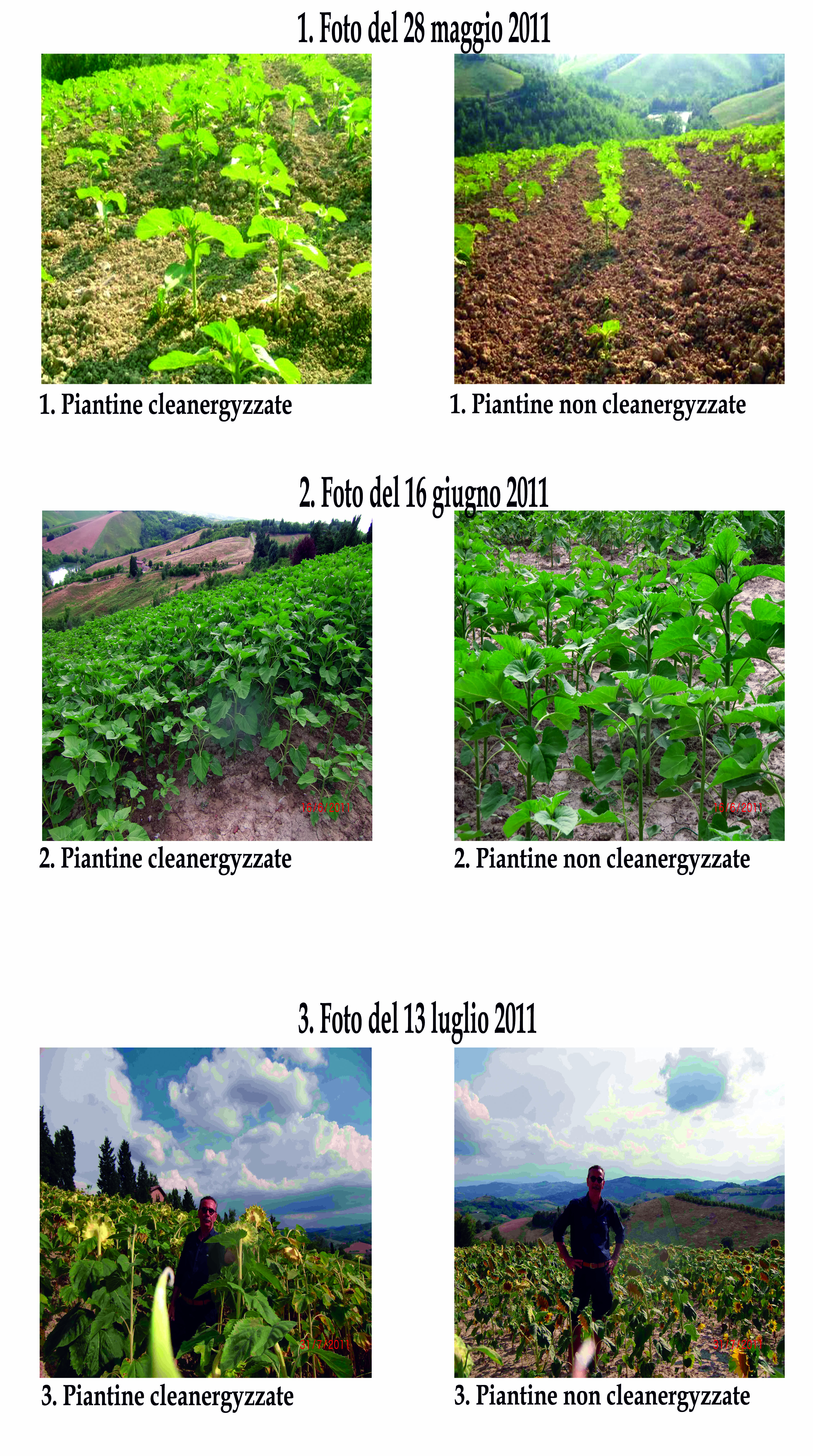 “Il girasole è stato piantato su circa 8 ettari di terreno collinoso, dell’Appennino Bolognese. I semi necessari per 6 ettari NON hanno subito alcun trattamento, mentre i circa 25 kg di semente necessaria per i 2 ettari sono stati esposti ad un trattamento con il Cleanergy + Booster per 10 giorni. Entrambi gli appezzamenti presentano spazi vuoti dovuti al dilavamento a seguito delle piogge del periodo. La semina è stata effettuata il 15 aprile del 2011.”