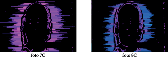 Nelle immagini si nota una distribuzione orizzontale di righe colorate intorno agli oggetti vibranti (le righe rappresentano le singole frequenze ottenute applicando la FFT acronimo di Fast Fourier Transform). Esse rappresentano orizzontalmente la distribuzione spettrale delle vibrazioni in una banda compresa tra 0,1 e 10 Hz secondo una scala in pseudo colori che va dal viola al rosso. Le vibrazioni generate dal corpo umano normalmente variano in continuazione nei vari punti del corpo stesso sia in ampiezza sia in frequenza, anche in modo rapido. Sullo schermo del PC un ampio riquadro mostra l’immagine della persona e attorno ad essa appaiono righe orizzontali di vari colori e lunghezze che rappresentano il risultato della FFT applicata alle vibrazioni rilevate. La frequenza delle vibrazioni viene visualizzata per mezzo del colore della riga stessa, secondo la scala di colore mostrata nell’immagine successiva.