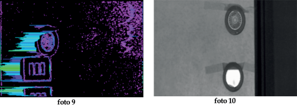 Foto 9: in questa immagine un Midi Cleanergy® vicino a due prese elettriche.Le prese elettriche sono attraversate da una corrente di 50hz ed infatti dallafoto risulta una vibrazione, il fattore stupefacente è che anche il dispositivo Midi Cleanergy® emette una vibrazione benchè non sia attraversato da nessuna corrente elettrica.
