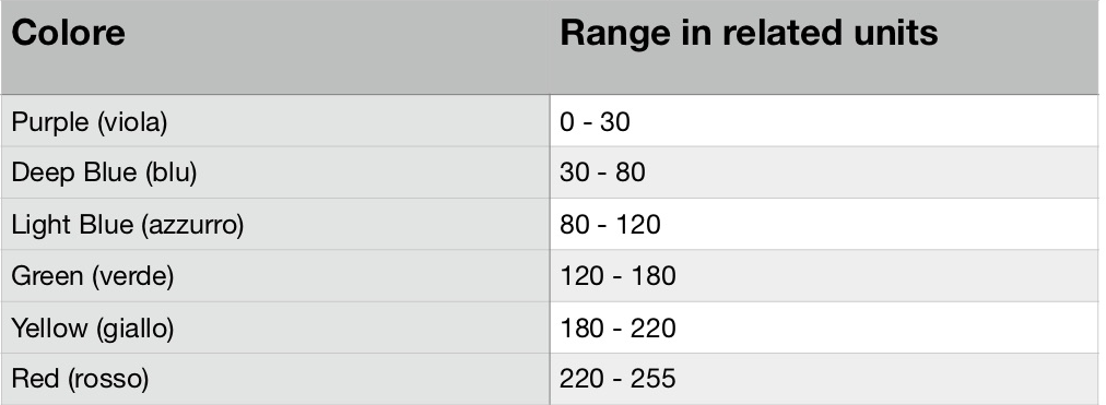 Nelle immagini si nota una distribuzione orizzontale di righe colorate intor- no agli oggetti vibranti (le righe rappresentano le singole frequenze ottenute con una FFT). Esse rappresentano in modo radiale orizzontalmente, la distribuzione spettrale delle vibrazioni in un range compreso tra 0,1 Hz e 10 Hz secondo una scala in pseudo colori (come mostrata sopra) che va dal viola al rosso. La suddivisione della frequenza vibrazionale in corrispondenza del colore è all’incirca questa: