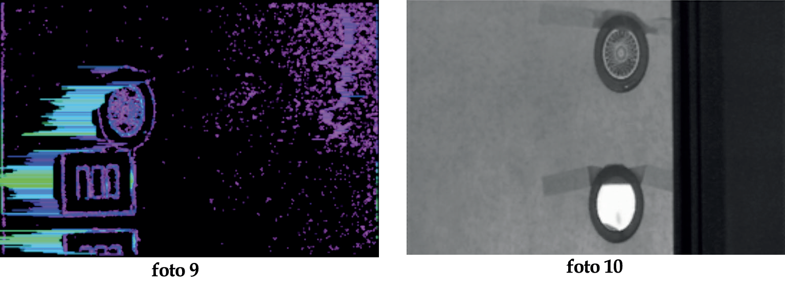 Foto 9: in questa immagine un Midi Cleanergy® vicino a due prese elettriche.Le prese elettriche sono attraversate da una corrente di 50hz ed infatti dallafoto risulta una vibrazione, il fattore stupefacente è che anche il dispositivo Midi Cleanergy® emette una vibrazione benchè non sia attraversato da nessuna corrente elettrica.
