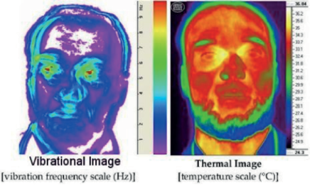 Nelle immagini si nota una distribuzione orizzontale di righe colorate intorno agli oggetti vibranti (le righe rappresentano le singole frequenze ottenute applicando la FFT acronimo di Fast Fourier Transform). Esse rappresentano orizzontalmente la distribuzione spettrale delle vibrazioni in una banda compresa tra 0,1 e 10 Hz secondo una scala in pseudo colori che va dal viola al rosso. Le vibrazioni generate dal corpo umano normalmente variano in continuazione nei vari punti del corpo stesso sia in ampiezza sia in frequenza, anche in modo rapido. Sullo schermo del PC un ampio riquadro mostra l’immagine della persona e attorno ad essa appaiono righe orizzontali di vari colori e lunghezze che rappresentano il risultato della FFT applicata alle vibrazioni rilevate. La frequenza delle vibrazioni viene visualizzata per mezzo del colore della riga stessa, secondo la scala di colore mostrata nell’immagine successiva.